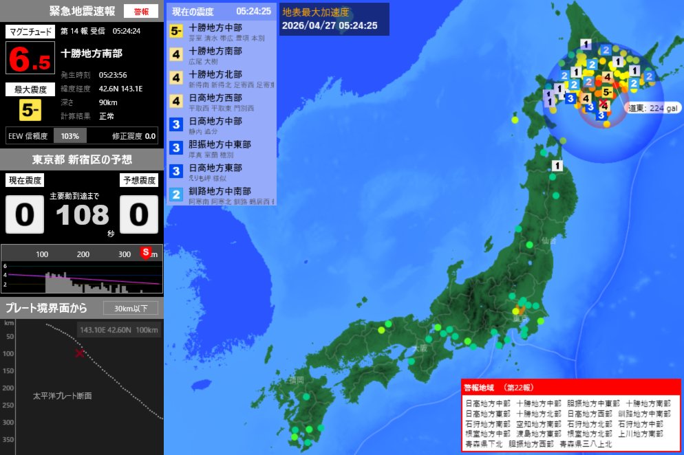 2026年4月27日午前5時23分頃、北海道十勝地方南部(北緯42.6度、東経143.1度、深さ80〜90km)を震源とするマグニチュード6.1(速報値)の地震が発生した。北海道十勝中部で最大震度5強を観測し、緊急地震速報(警報)が北海道の広い範囲と青森県の下北・三八上北地方にも発表された。