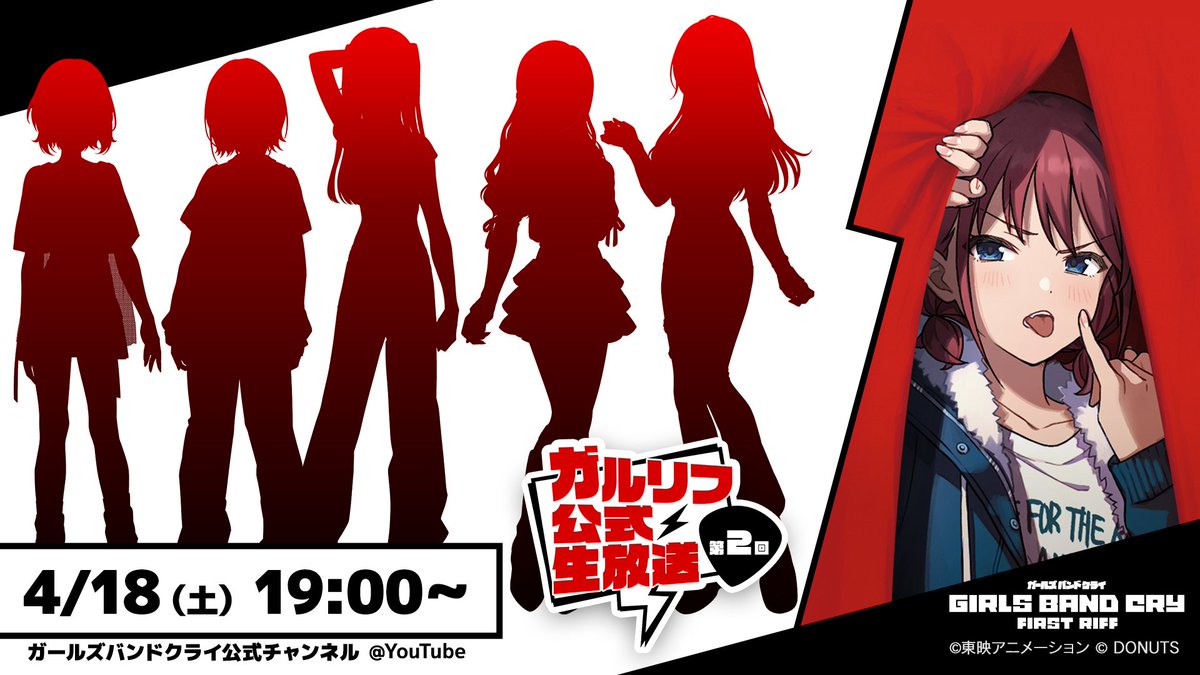 本日2026年4月18日19時より、スマートフォンゲーム『ガールズバンドクライ First Riff(ガルリフ)』の第2回公式生放送がYouTubeで配信され、新バンド「F-272(エフニナ)」のお披露目が行われたことで、#ガルリフ公式生放送 がトレンド入りした。