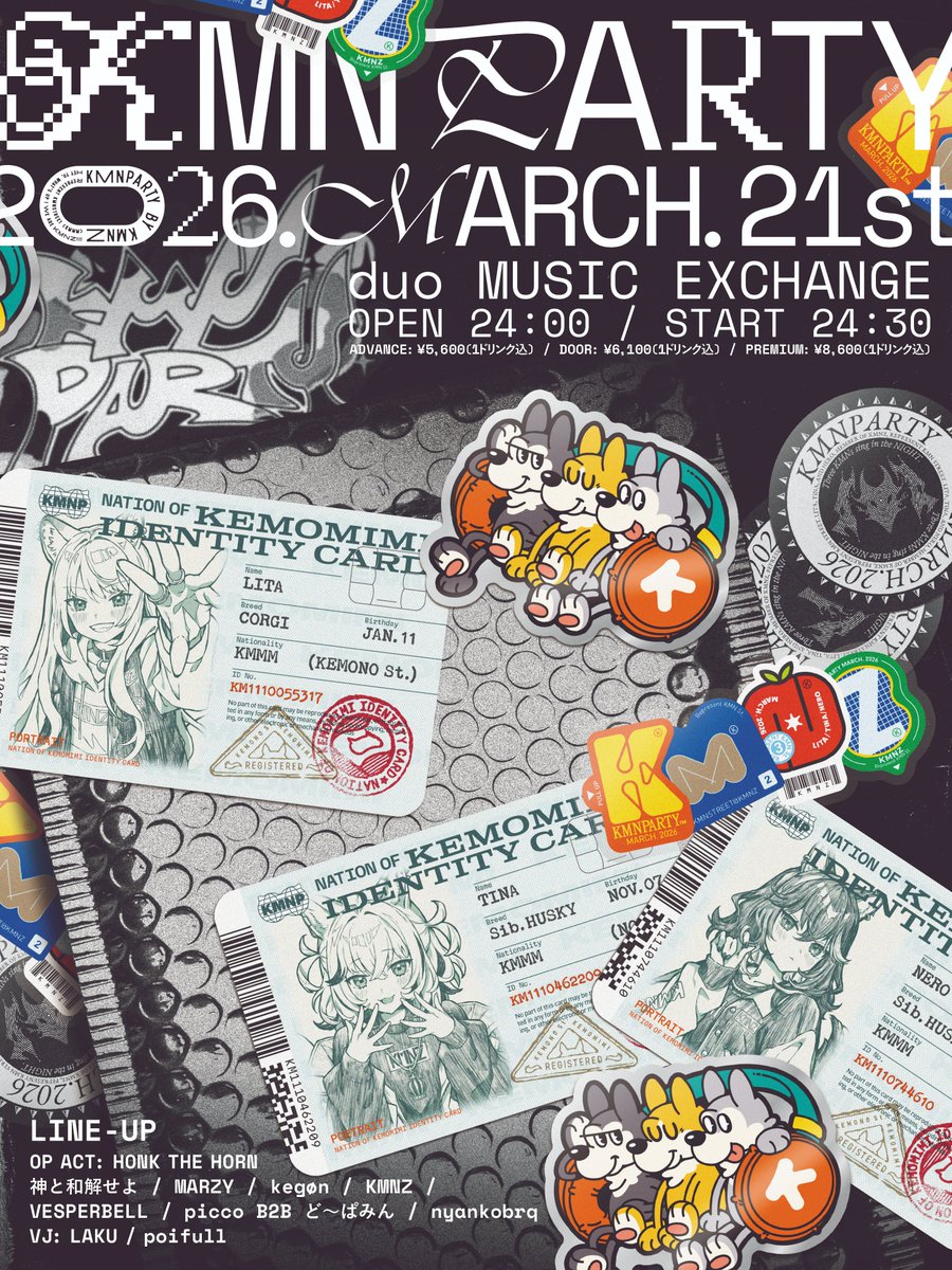 KMNPARTYは2025年8月15日に東京・代官山UNITで初開催(vol.1)されたKMNZ主催のナイトクラブイベントシリーズ。20歳未満入場禁止・顔写真付き身分証必須のクラブ形式で、チケットはZAIKOにて先着販売されている。今回は2026年3月21日開催分にあたる。