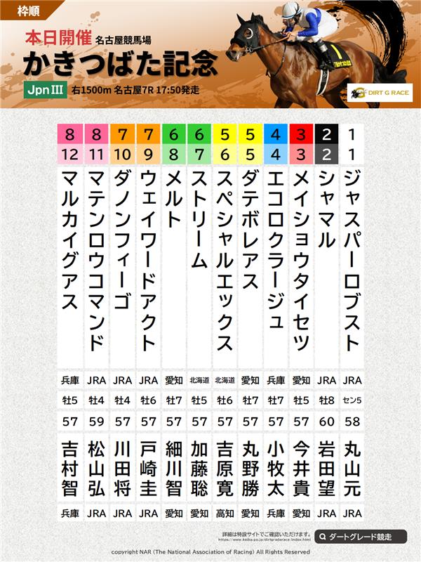 かきつばた記念は1999年に創設された歴史ある重賞で、競走名は愛知県の県花「かきつばた」に由来する。2022年の競馬場移転に伴い距離が1400mから1500mに変更され、2024年からは施行時期が5月上旬から2月下旬に移設されるとともに、ハンデ戦からグレード別定戦へと変更された。この時期変更により、春のJpnI重賞「かしわ記念」へのステップレースとして位置づけられ、JRA所属馬と地方馬が激突する注目の一戦として競馬ファンの関心が高まっている。