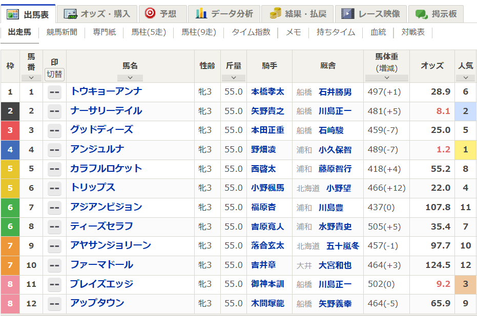 03/18(水) 浦和11R 桜花賞 ◎④アンジュルナこのメンバーではすでに格付けが済んでおり、能力上位は明確。Tiz the Law産駒らしい圧倒的なスピードが武器で、先行〜番手で折り合えれば安定して力を出せるタイプ。 好位で流れに乗り、直線でスムーズに抜け出す形に持ち込めれば勝ち負け濃厚。