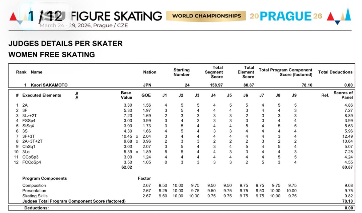 演技の完成度は採点にも表れており、ジャッジの一人がプログラムコンポーネンツスコア(PCS)の全項目に満点10.00を付けるという異例の事態が話題を呼んだ。現地プラハでは演技直後から得点発表まで全観客がスタンディングオベーションを続けるという光景も生まれた。