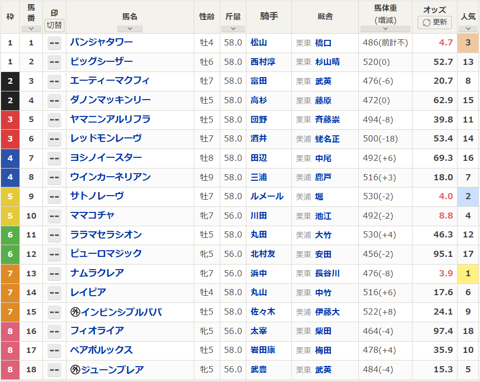 引退レースには、長きにわたりコンビを組んできた浜中俊騎手が7戦ぶりに騎乗。長谷川調教師は「これで負けたら『しゃあない』。応援よろしくお願いします」と自信のコメントを残し、前日オッズでは3.4倍の1番人気に支持された。枠順は7枠13番、馬体重は476kg(前走比-8kg)だった。