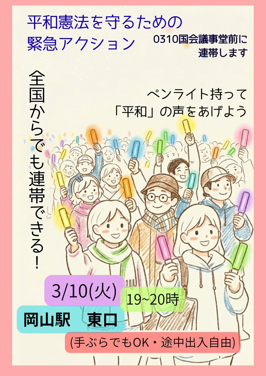この運動の特徴は、従来の組合・政党主導の運動とは異なる個人参加型の市民運動としての性格だ。「手ぶらOK」「コール苦手ならしなくてOK」「途中参加もOK」「1人の人もたくさんいる」といった参加ハードルを下げるメッセージが積極的に共有され、幅広い層への参加を促している。また、東京の国会前だけでなく、岡山では3月6日に64名が集まる連帯アクションが行われ、広島からも連帯の声が上がるなど全国的な広がりを見せている。
