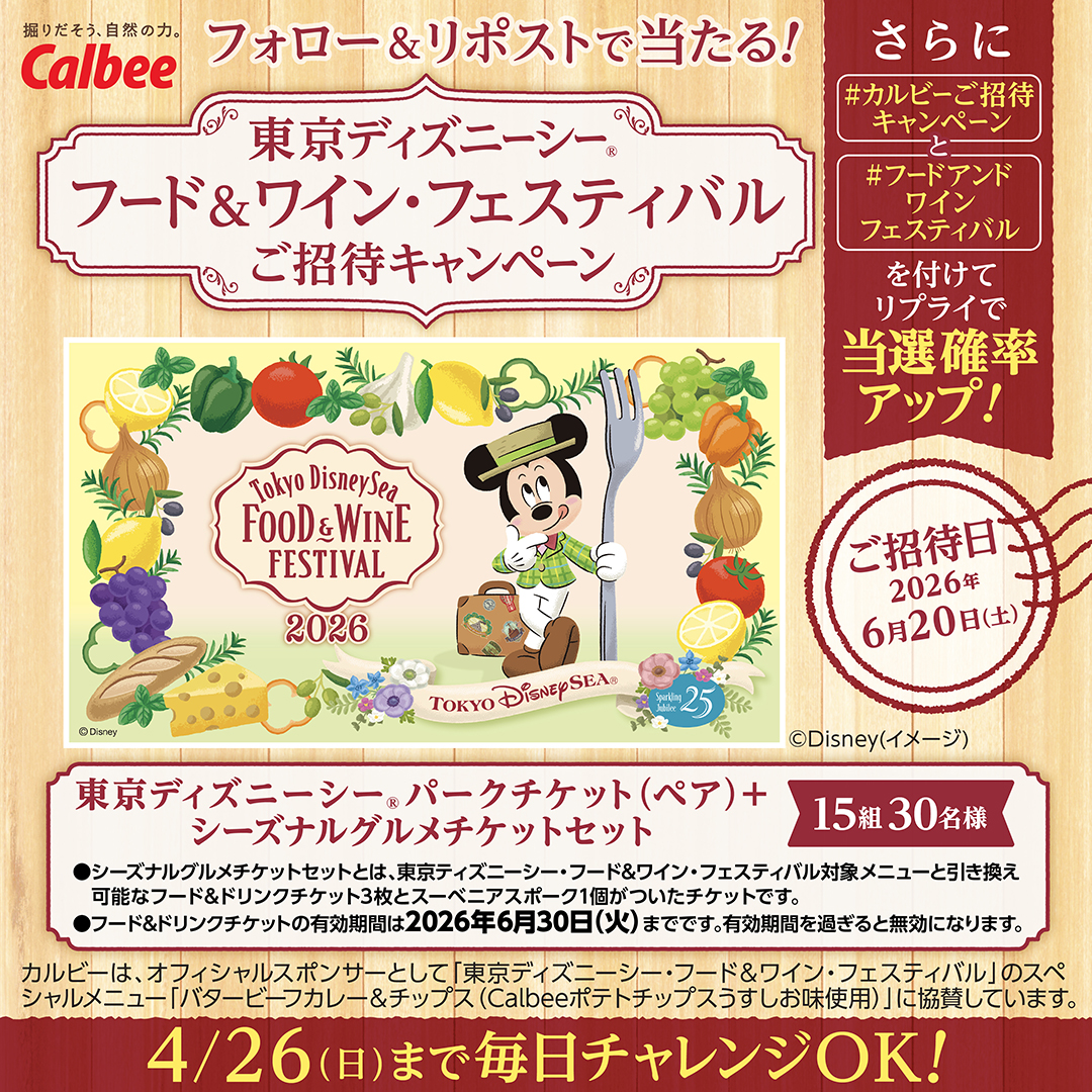 カルビー公式X(@calbee_PR)が2026年4月13日10時01分に投稿した「東京ディズニーシー・フード&ワイン・フェスティバルご招待キャンペーン」が、本日Xのトレンドに浮上している。