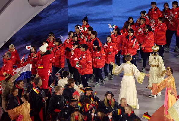 日本代表の旗手を務めたのは、フィギュアスケート女子で銀メダルを獲得し今季限りでの引退を表明している坂本花織と、スピードスケート男子の森重航。坂本は団体と個人の両方で銀メダルを獲得しており、最後の大舞台で笑顔の入場行進を見せた。旗手就任の際に森重航が坂本に深々とお辞儀でお願いする場面も事前に話題となっていた。
