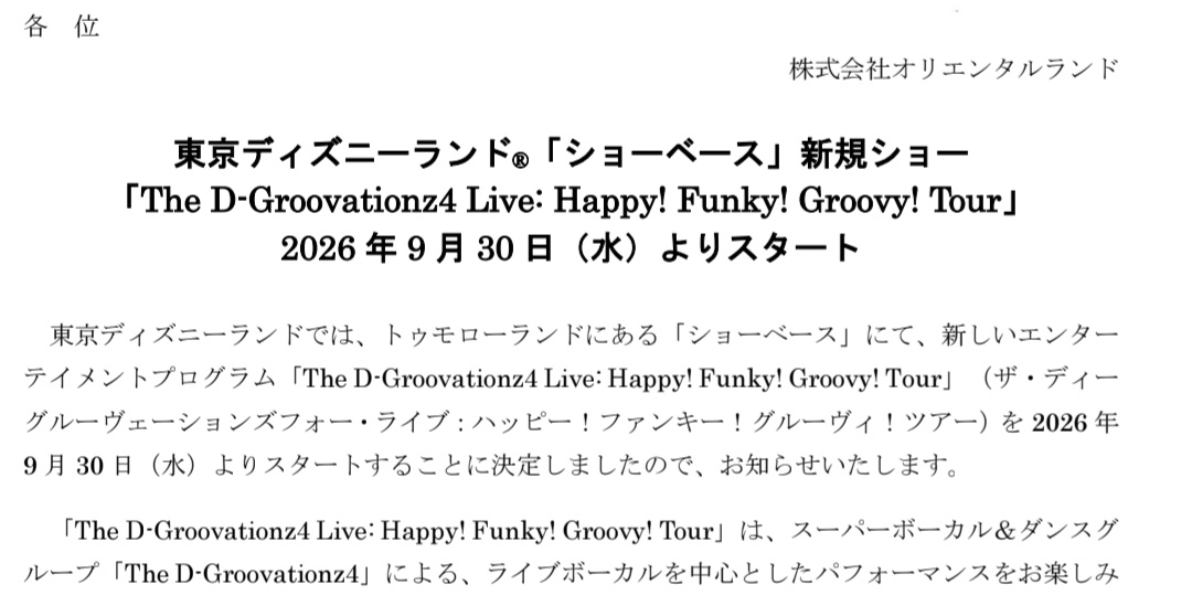東京ディズニーランドのショーベースに待望の新ショーが誕生する。2026年3月23日、オリエンタルランドは「The D-Groovationz4 Live: Happy! Funky! Groovy! Tour」を正式発表し、ディズニーファンの間で大きな話題となっている。
