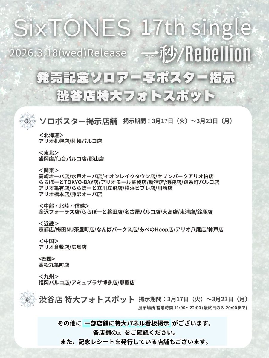 SixTONESの17thシングル「一秒 / Rebellion」が2026年3月18日(水)の発売を2日後に控えた3月16日(月)、TBS系「CDTVライブ!ライブ!」で「一秒」と「Rebellion」のフルサイズテレビ初披露が行われ、ハッシュタグ「#SixTONES_一秒」がトレンド入りした。