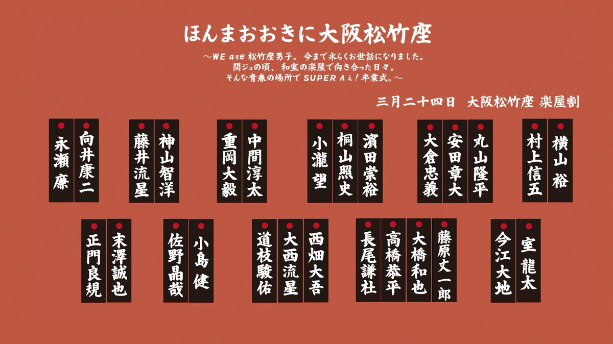 本日2026年3月24日、大阪・道頓堀の大阪松竹座にて『ほんまおおきに大阪松竹座〜WE are 松竹座男子。今まで永らくお世話になりました。関ジュの頃、和室の楽屋で向き合った日々。そんな青春の場所でSUPER Aぇ!卒業式。〜』が開催され、SNSで大きな話題となっている。