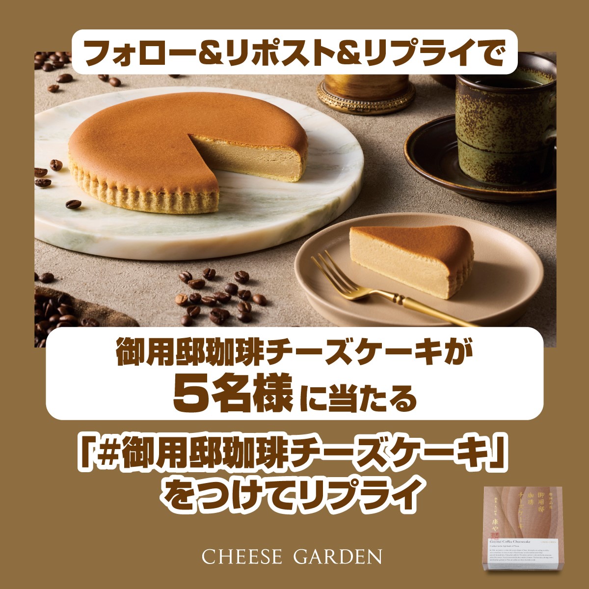 キャンペーンへの参加を希望する場合は、2026年4月28日23:59の締め切りまでに、@cheesegardenをフォローしたうえでリポストし、ハッシュタグ#御用邸珈琲チーズケーキを付けてリプライを送る必要がある。
