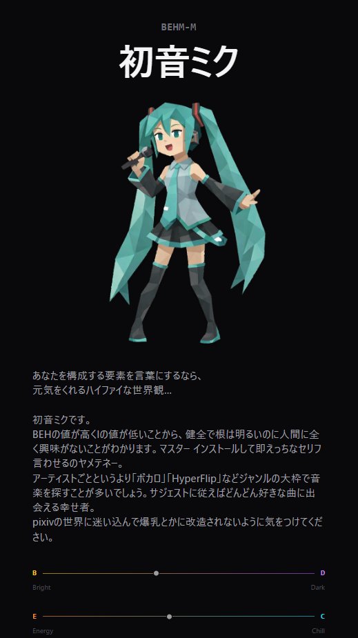診断結果には音楽特性を示す複数のスライダー(Bright/Dark、Energy/Chillなど)と、結果に対する解説文が付いており、「解説が面白い」という声もある。結果の意外性だけでなく、その解説のユーモアや辛辣さもシェアを後押ししている要因のひとつだ。