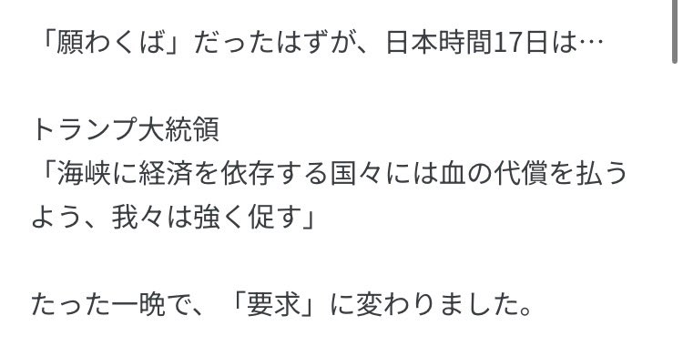 艦船派遣めぐり…トランプ大統領、日本を名指しし要請「血の代償を払うよう強く促す」 https://t.co/WlYUUbLAw2
