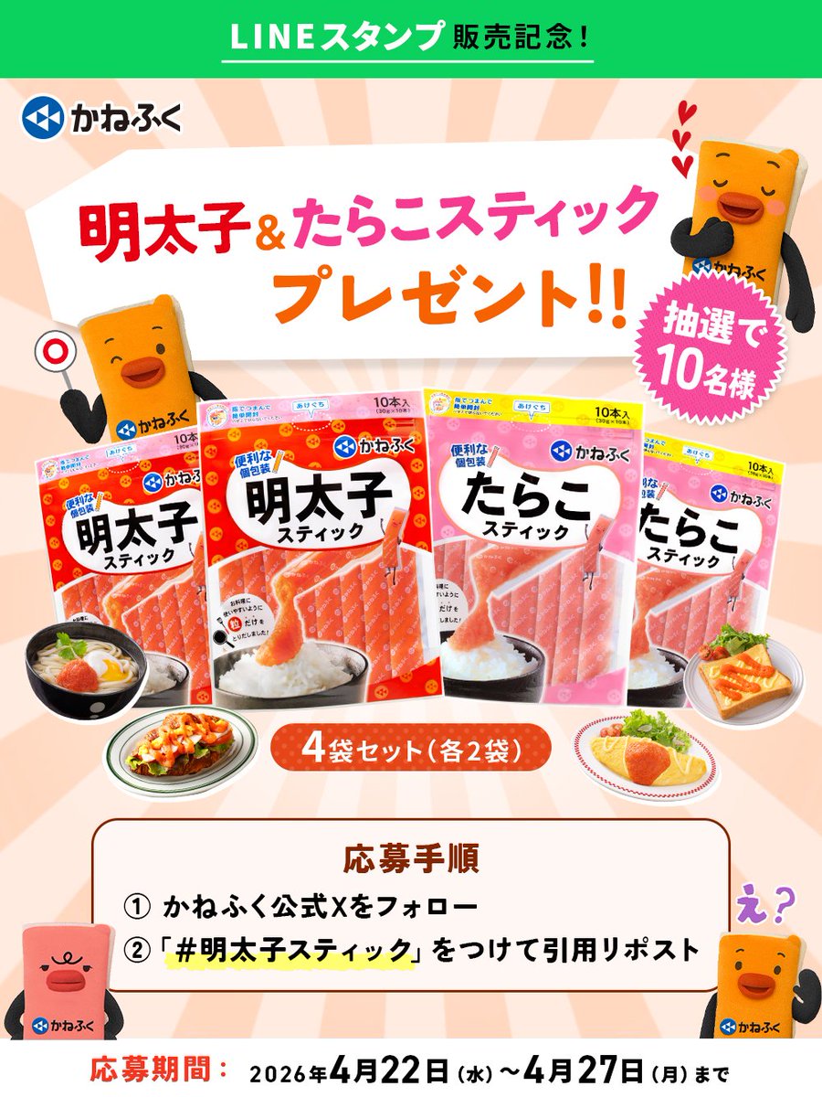 2026年4月22日、明太子メーカー「かねふく」の公式XアカウントがLINEスタンプの販売開始を記念したプレゼントキャンペーンを開始し、#明太子スティックがトレンド入りした。