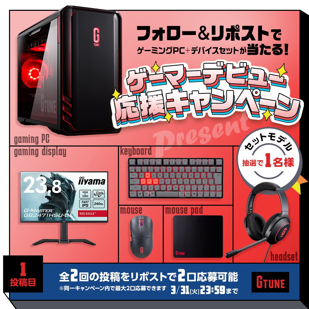 マウスコンピューターのゲーミングブランド「G-Tune/NEXTGEAR」の公式Xアカウント(@GTUNE_NEXTGEAR)が2026年3月24日18時01分に「ゲーマーデビュー応援キャンペーン」を投稿したことで、「#GTUNEでゲーマーデビュー」がXのトレンドに急浮上した。