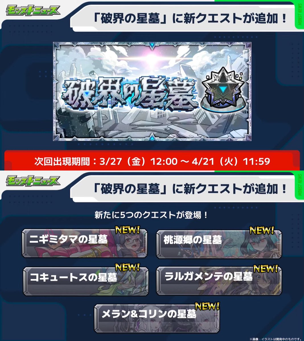 今回追加されるのは「ニギミタマの星墓」「桃源郷の星墓」「コキュートスの星墓」「ラルガメンテの星墓」「メラン&コリンの星墓」の5クエスト。出現期間は3月27日から4月21日で、バトル突破報酬としてメラン&コリンが新たに追加される。