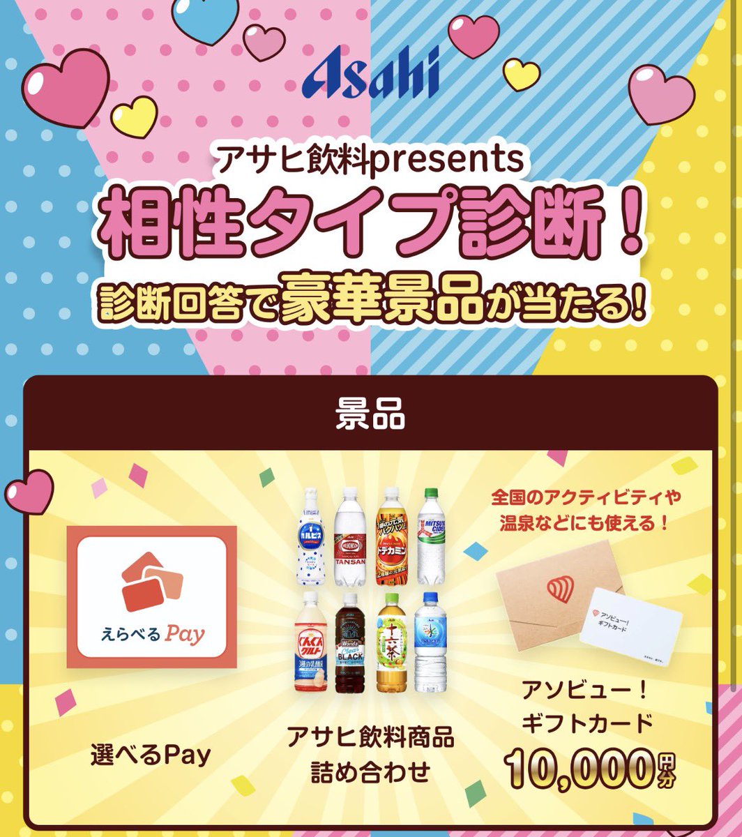 このキャンペーンはアサヒ飲料の公式LINEアカウントを通じて参加できる診断コンテンツで、診断を受けると自分の「相性タイプ」が判定される仕組みだ。さらに、参加者の中から抽選で1万名にえらべるPayなどが当たる懸賞も用意されており、プレゼント目当ての参加者も多い。キャンペーン期間は2026年2月20日から3月13日まで。