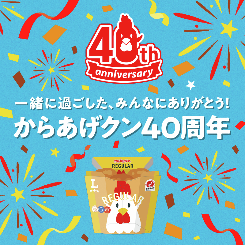 今後の展開としては、40周年記念新フレーバー第2弾「からあげクン夢のMIX味」が4月14日、第3弾「サクッと!からあげクン塩味」が4月28日に発売予定。また40周年記念グッズ5品(ミニタオル・ランチトートバッグ・靴下・ポロシャツなど)も4月14日から販売開始される予定で、祝祭ムードはしばらく続きそうだ。