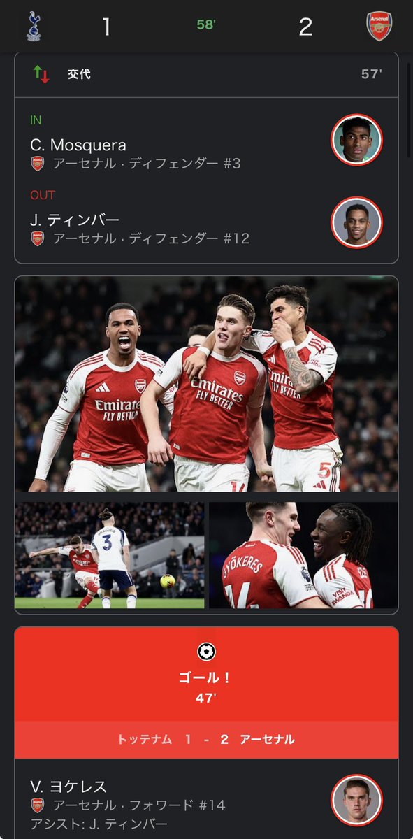 ノースロンドンダービーはアーセナルとトッテナムの伝統の一戦であり、通常の試合以上にサポーターの感情が高ぶる舞台。その大一番での勝ち越しゴールだけに、アーセナルサポーターの興奮は特別なものとなった。今後もギョケレシュの活躍がアーセナルのタイトル争いを左右する重要な鍵となりそうだ。