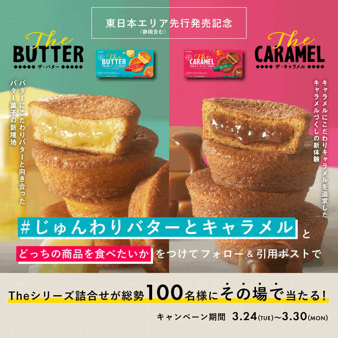 ロッテの新商品「The BUTTER」と「The CARAMEL」を巡るXキャンペーンが、2026年3月24日にトレンド入りした。同日、詰め合わせを100名様にプレゼントするキャンペーン告知がXに投稿され、ハッシュタグ「#じゅんわりバターとキャラメル」を付けた参加投稿が一斉に急増したことがトレンド入りの直接の要因だ。
