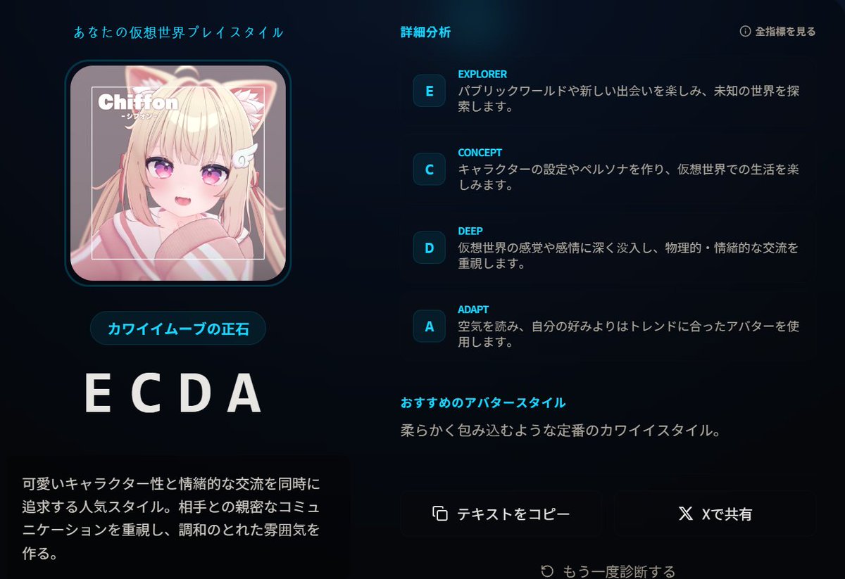 あれ…ここでも可愛いって言われるの…?? おかしい…… [VRCTI結果] タイプ: ECDA、カワイイムーブの正石型 https://t.co/rDYOLLH6tm #VRCTI#VRChat
