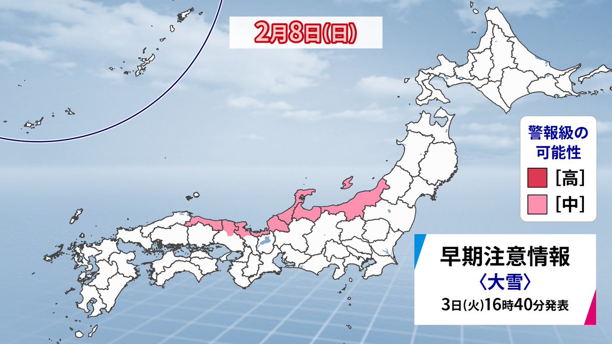 SNS上では、2月初旬から気象情報に詳しいアカウントが大雪警報級の可能性を継続的に発信しており、2月3日の時点で日曜日(8日)の大雪警報級の可能性が指摘されていた。2月6日には島根から京都にかけて大雪警報級の可能性が「高」と発表され、関東でも警報級となる恐れがあると注意喚起がなされていた。