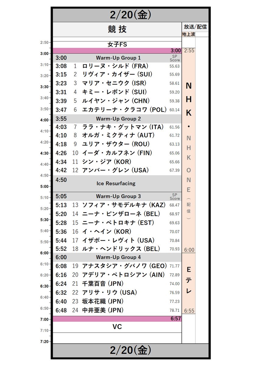 今大会の女子フリースケーティングは日本時間の早朝に行われ、坂本花織は6:40頃から滑走。金メダルはアリサ選手、銅メダルは亜美ちゃんと呼ばれる選手が獲得したとされており、日本人選手3名が表彰台に絡む好成績となった。百音ちゃんと呼ばれる選手も6:24頃から滑走しており、日本勢の活躍が際立つ大会となった。
