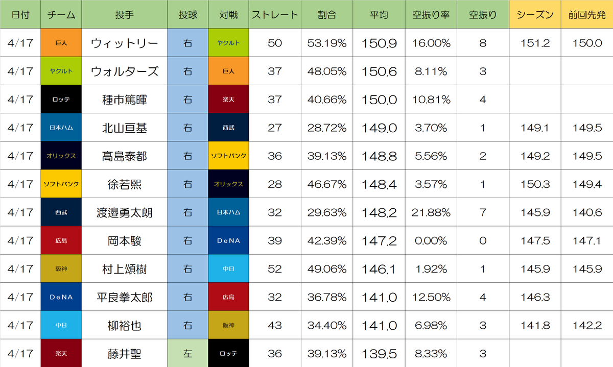 ウォルターズは当日に一軍登録されたばかりで、そのまま即日先発という異例の起用だった。池山隆寛監督は今月頭から4月17日の登板を計画し、開幕ローテ組の休養を逆算してこの起用を決めていたと明かしている。しかし結果は1回に4失点、3回にも3失点と制球が定まらず、2度の押し出し四球を含む乱調で3回途中にKO。試合はヤクルト2-8で巨人に完敗し、ウォルターズが敗戦投手となった。対戦相手の巨人先発ウィットリーが7回無失点と好投したことも、明暗を際立たせた。
