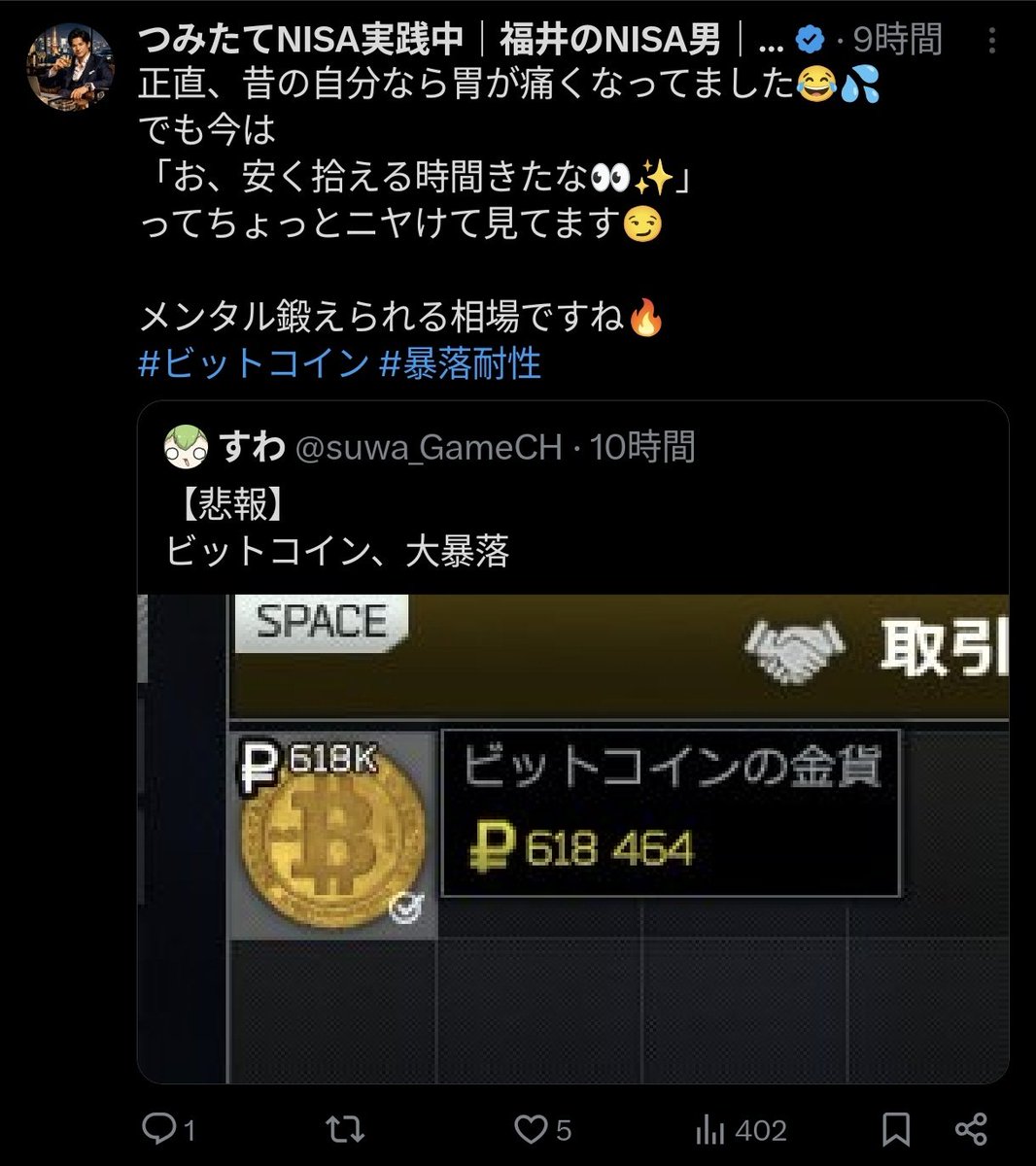 一方で、2月4日にはビットコインETFに資金流入が確認されており、割安感を狙った買いの動きも出始めている。SNS上では「バフェットを見習え」といった投資姿勢への警鐘や、さらなる下落を予想する声が見られる。今後は6万ドルの心理的節目を維持できるかが焦点となる。