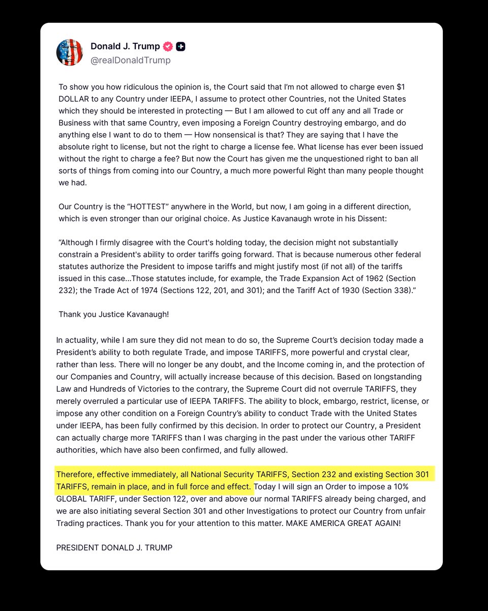 その上でトランプ大統領は、代替措置として1974年通商法122条を根拠に全世界からの輸入品に10%の追加関税を課す命令に署名すると表明した。X上の投稿によれば、この措置は最大150日間・15%以内という制約のもとで発動されるもので、それ以上の延長には議会の承認が必要となる。また「現在ある関税はそのままで、さらに10%の追加関税を課す」とも主張しており、既存の国家安全保障関税(Section 232)や対中関税(Section 301)は維持される見通しだ。
