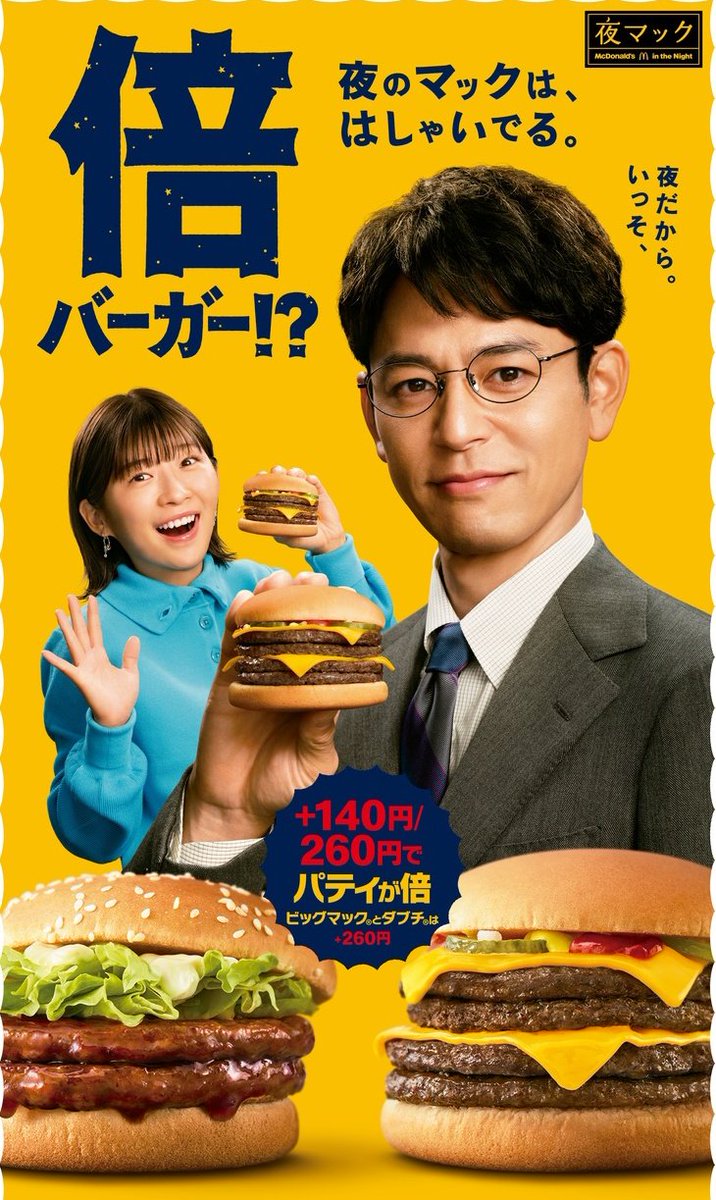 今回のキャンペーンは、夜マック(17:00〜)限定メニュー「倍バーガー」の販売開始7周年・累計販売数1.8億食突破を背景に実施されている。倍バーガーとは通常のバーガーのパティが2倍になるメニューで、2024年の人気ランキングでは1位が倍ダブルチーズバーガー(600円)、2位が倍ビッグマック、3位が倍てりやきマックバーガー(470円)となっている。
