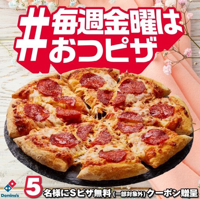 2026年4月10日(金)17:00〜18:00の1時間限定で実施された今週のキャンペーンは、①@dominos_JPをフォロー、②「#毎週金曜はおつピザ」をつけて「春の思い出の曲」を引用リポストするという参加方法で、抽選で5名にお持ち帰り限定Sピザ1枚(一部対象外)の無料クーポンをプレゼントする内容。当選者のみ4月13日中にDMで通知される。