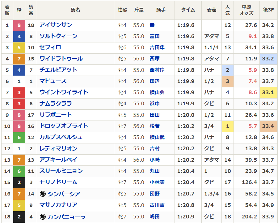 【#愛知杯 入線速報】 1位入線 18アイサンサン12人気 2位入線 8 ソルトクィーン 5人気 3位入線 10セフィロ 13人気 幸英明騎手騎乗、アカイイト全妹アイサンサンが二枚腰発揮し重賞初制覇! https://t.co/wnzre0JqSU