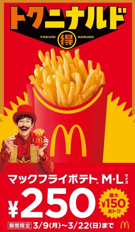 本日2026年3月9日(月)から、マクドナルドの「トクニナルド」キャンペーンがスタートし、マックフライポテトのM・LサイズがどちらもLサイズ250円で購入できるようになったことが話題を呼んでいる。