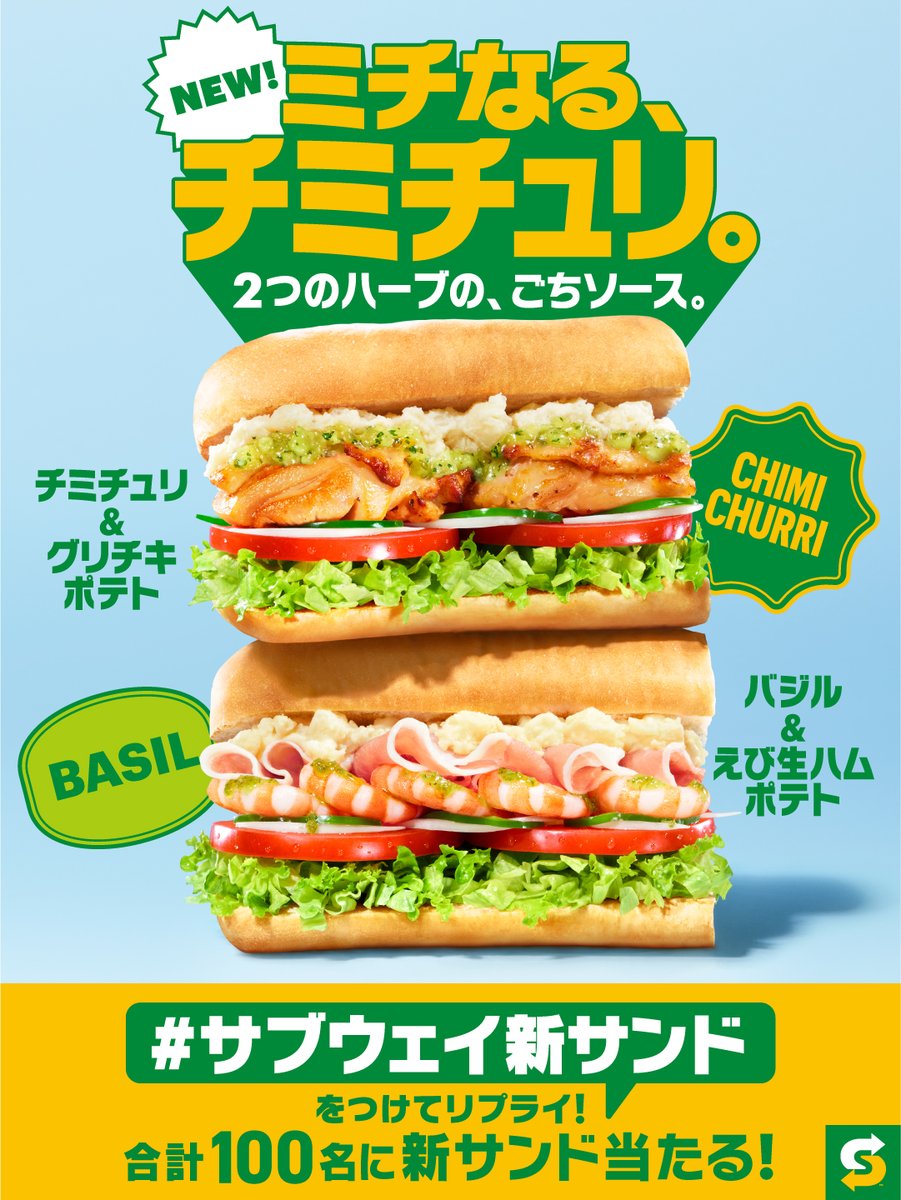 今回の新サンドは、南米発祥のハーブソース「チミチュリ」を使った「チミチュリ&グリチキポテト」と、「バジル&えびバジル生ハムポテト」の2種類。ハーブの爽やかな風味を前面に押し出した春らしいラインナップとなっている。