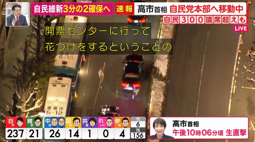 ロイターによると、自民党は単独で「絶対安定多数」を上回る議席を獲得。TBS NEWS DIGの冒頭議席予測でも、与党で憲法改正の発議に必要な3分の2を超える勢いと報じられた。一方、野党の中道は公示前の半数を下回る見通しとなり、歴史的な大敗を喫した。