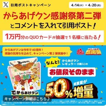 キャンペーンはお得な増量販売だけにとどまらない。ローソン公式Xアカウント(@akiko_lawson)をフォローし、「#からあげクン感謝祭第二弾」をつけて引用ポストすると、特製純金からあげクン15gやQUOカード1万円分が当たる抽選キャンペーンも同時開催中だ。プレゼント目当ての参加投稿もトレンド入りの一因となっている。