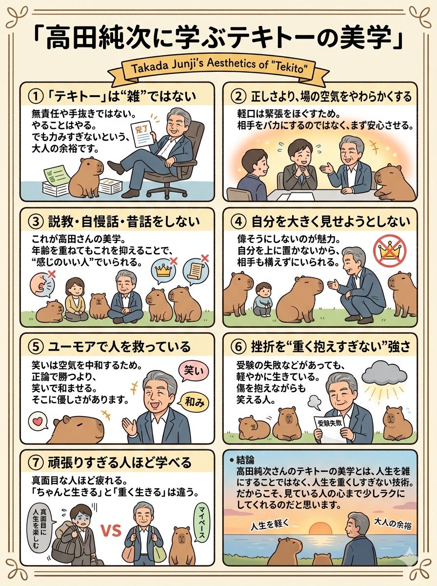 きっかけのひとつとなったのは、俳優・タレントの高田純次に関するX投稿だ。「頑張りすぎて苦しくなった時こそ、この軽やかさが大事になってくる」「重く生きないのに、決して薄くもない」という内容の投稿が共感を呼び、拡散された。高田純次は「テキトー男」として知られ、「適当」を「適材適所=肩の力を抜いて楽しく生きること」と解釈する哲学を持つ人物。毎年「今年の目標は?」と聞かれると「ただ生きる」と答えることでも知られており、著書『高田純次のテキトー格言』もAmazonで販売されている。新年度という緊張感が高まりやすい時期に、この「力の抜き方を知っている大人の知性」というメッセージが多くの人の心に響いた形だ。