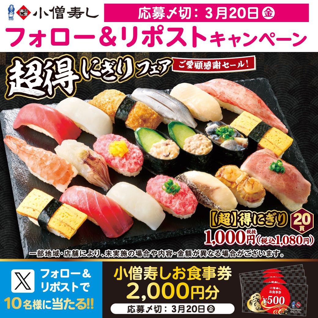 グルメ面では、小僧寿しの「超得にぎりフェア」(税込1,080円・20貫)にモバイルオーダーの100円OFFクーポンを組み合わせると実質980円、1貫あたり約49円になるという体験投稿が「スーパーより安いのに美味い」という感想とともに拡散し、クーポン活用の実例として高い共感を集めた。