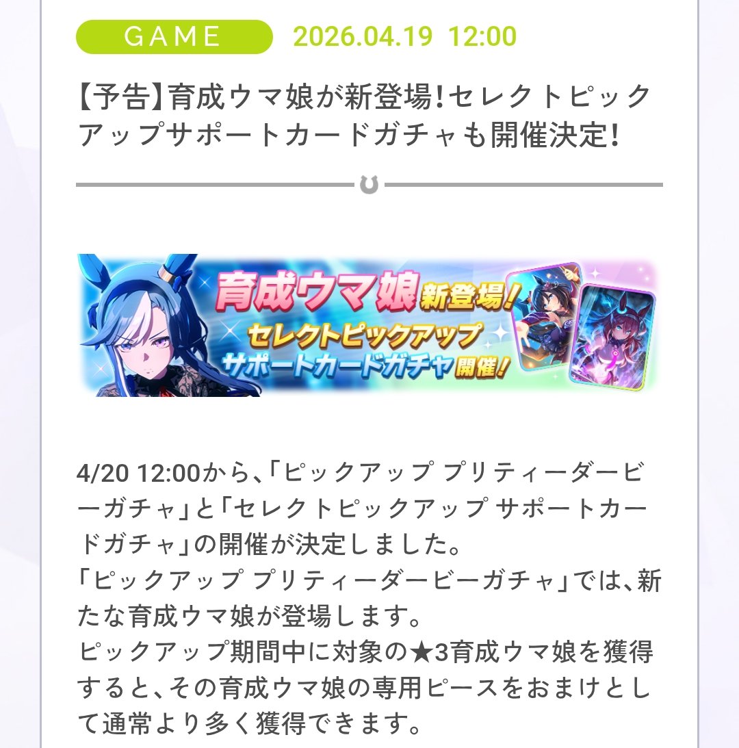 4月20日の正式実装後、育成ウマ娘としてのシナリオや性能評価が明らかになることで、さらなる話題の広がりが期待される。