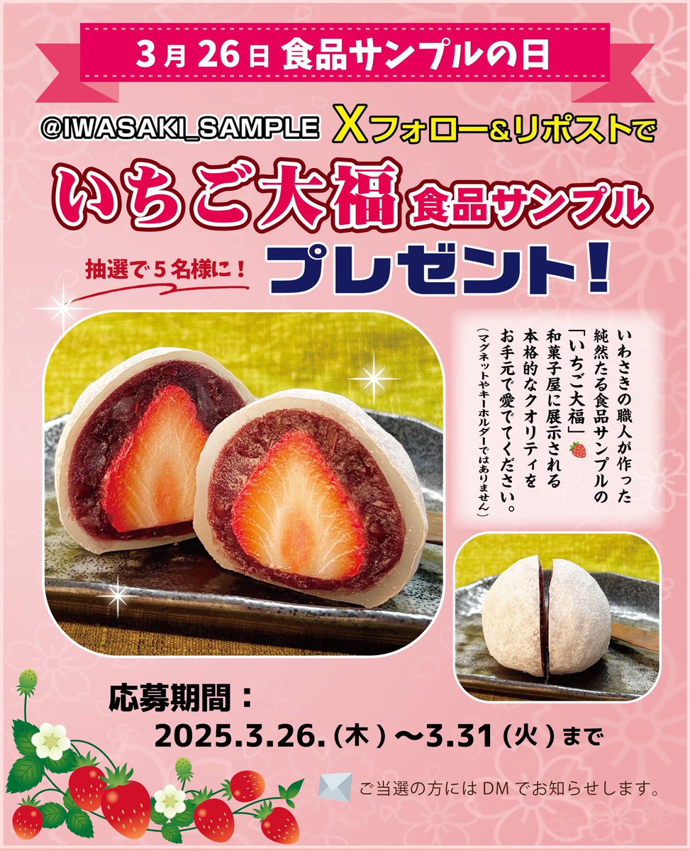 記念日当日に合わせ、いわさきグループの公式Xアカウント「IWASAKI_SAMPLE」が非売品のいちご大福の食品サンプルを抽選で5名にプレゼントするキャンペーンを開始。別アカウント「IWASAKI_BtoC」でも食べかけのたいやきの食品サンプルを2名にプレゼントするキャンペーンが同時展開されており、応募期間はいずれも3月26日から31日までとなっています。応募方法はフォロー&リポストで、引用リポストに「#食品サンプルの日」ハッシュタグを付けると当選確率がアップするとされています。