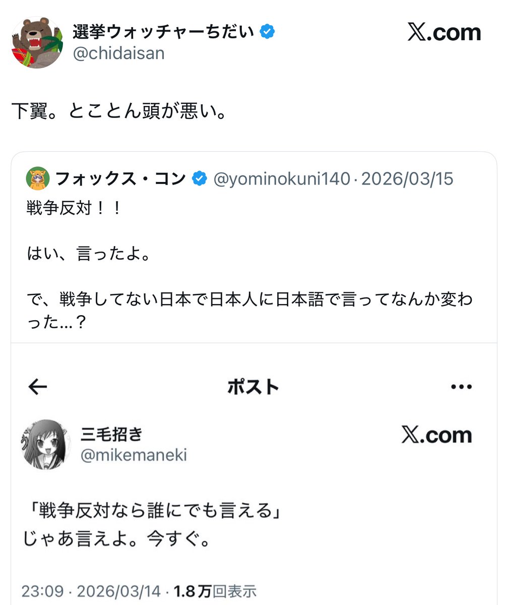 3つ目は政治系Xアカウント「フォックス・コン」(@yominokuni140)の炎上だ。同アカウントが「戦争反対!!」と投稿したところ、左派から批判を受けたと主張する投稿が拡散。「戦争反対と言いにくい国にするのはやめて」という訴えをめぐり、左右の対立構図が生まれた。