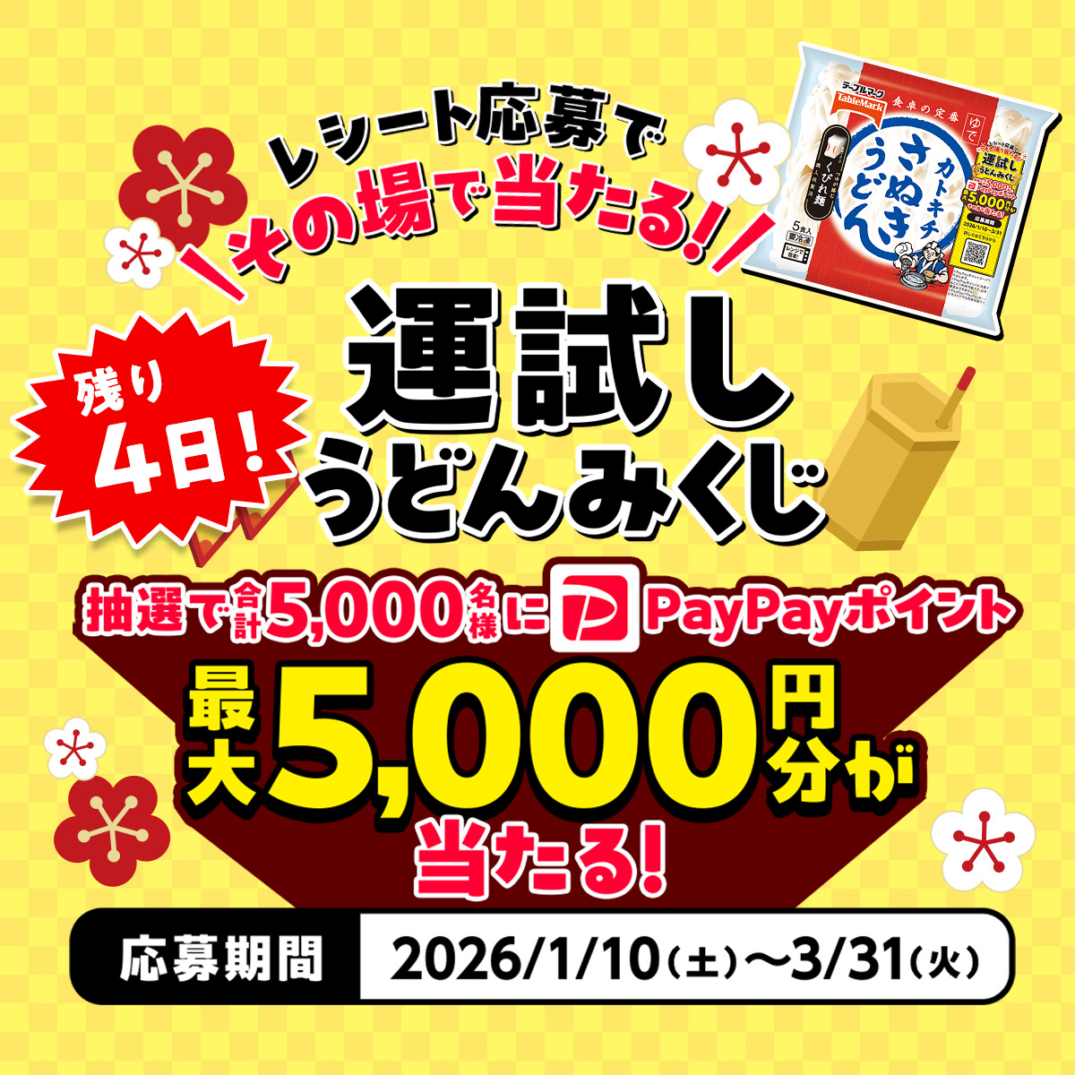 なお、テーブルマーク「カトキチさぬきうどん」の「運試しうどんみくじ」キャンペーン(抽選で合計5,000名にPayPayポイント最大5,000円分が当たる企画)は、受付期間が2026年1月13日〜3月31日で、現在はすでに受付終了済みとなっている。