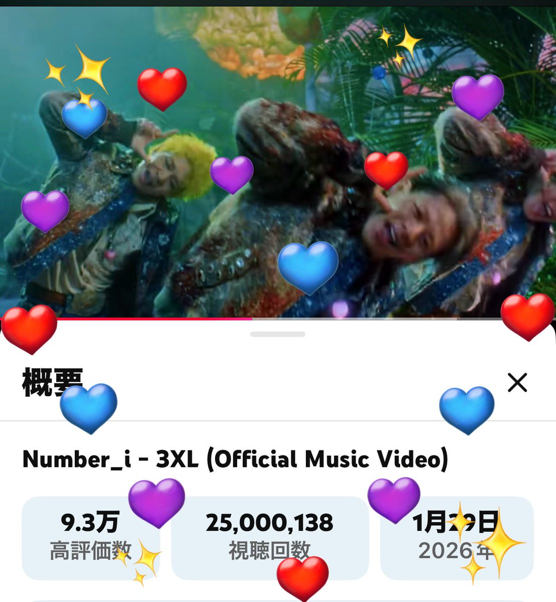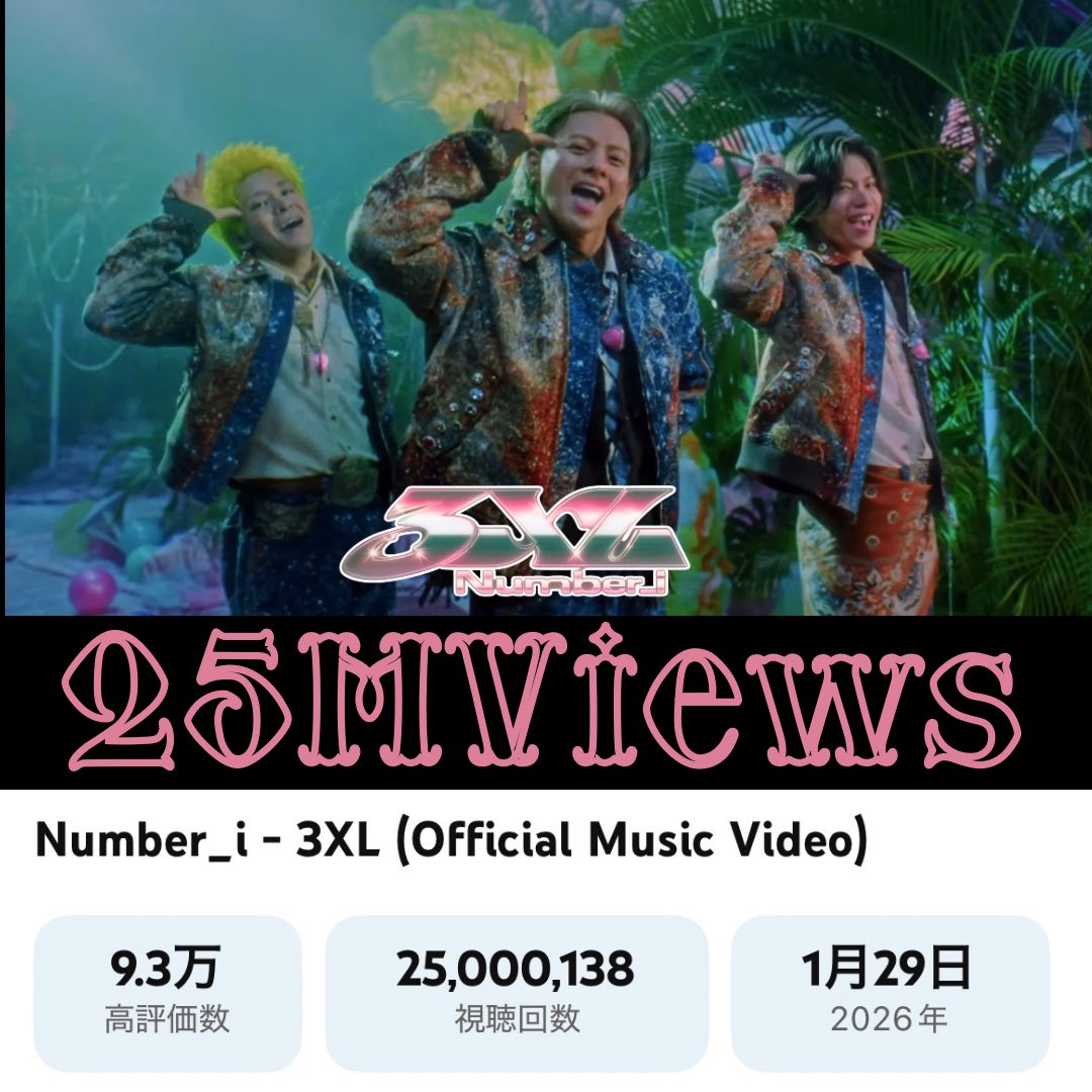 Number_iの楽曲「3XL」のMVが2500万回再生を達成したことを受け、2026年3月16日の朝、ファンたちが「#Ni_3XL_25Mviews」ハッシュタグを一斉に投稿し、Xのトレンドに浮上した。