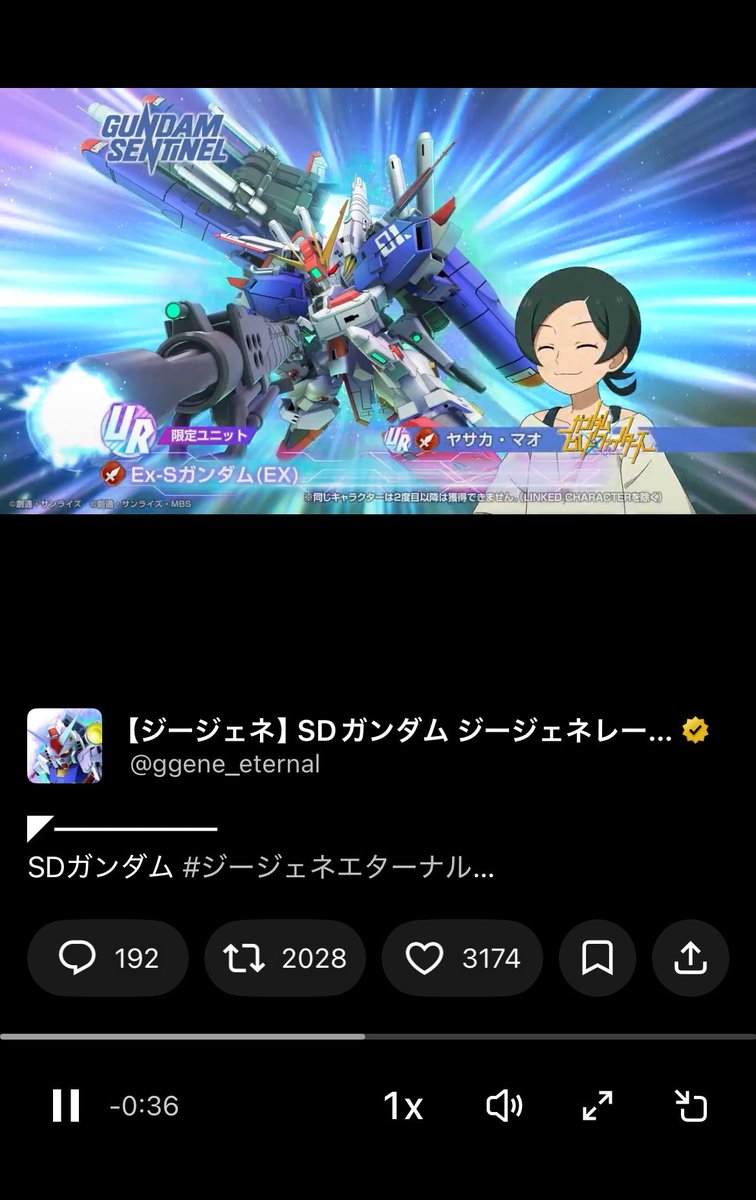 スマートフォンゲーム「SDガンダム ジージェネレーション エターナル(Gジェネエターナル)」の公式が2026年4月16日実装予定の新ユニットとしてUR「Ex-Sガンダム(EX)」を発表した。しかし、そのパイロットとして本来の搭乗者であるリョウ・ルーツではなく、UR「ヤサカ・マオ」が採用されたことがX上で大きな話題となり、「リョウ・ルーツ」がトレンド入りした。